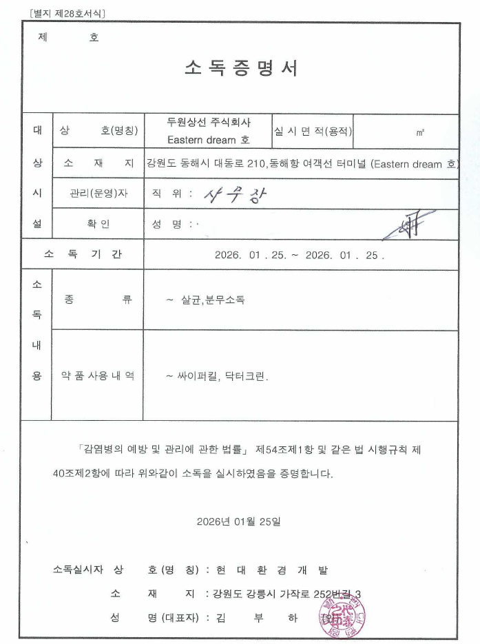 공지이스턴드림호 정기 소독 실시2026-02-02◆ 이스턴드림호는 전염병 확산 및 해충 방지를 위해 직원 자체 소독은 물론 연 2회 외부업체를 통해 선박 전체를 소독을 하고 있습니다.안심하고 이용해 주시기 바랍니다.